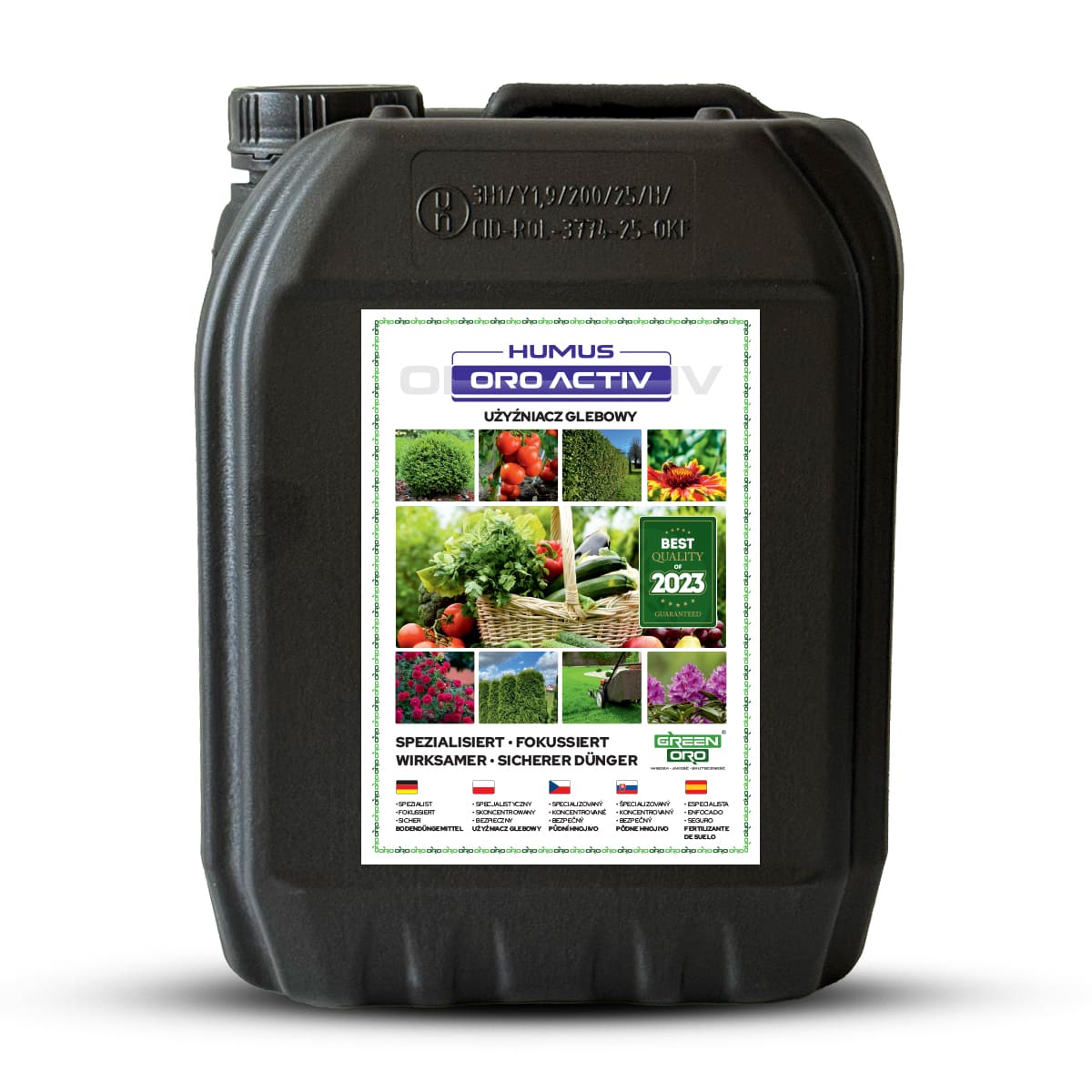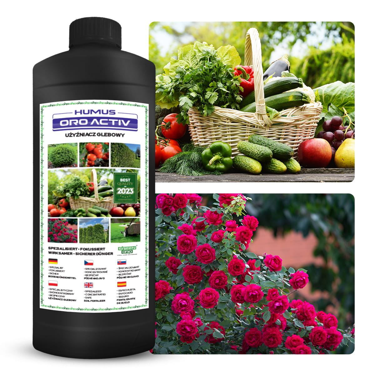 HUMUS ORO ACTIV użyźniacz glebowy całoroczny płynny koncentrat kwasów humusowych i fulwowych, do warzyw, owoców, trawnika, róż, tui i wszystkich roślin ogrodowych. Poprawia strukturę gleby i dostępność składników pokarmowych przez cały sezon.
